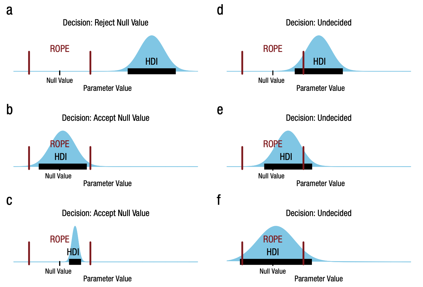 Remain undecided: If the HDI is partially or fully outside the ROPE.