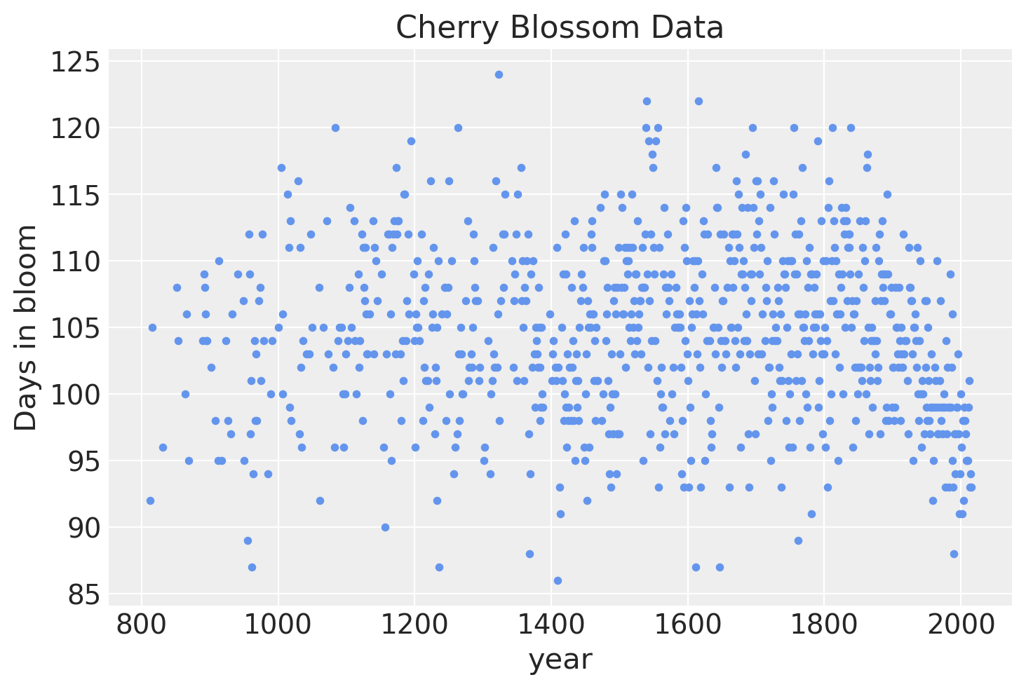 The data for this example is the number of days (doy for “days of year”) that the cherry trees were in bloom in each year (year).