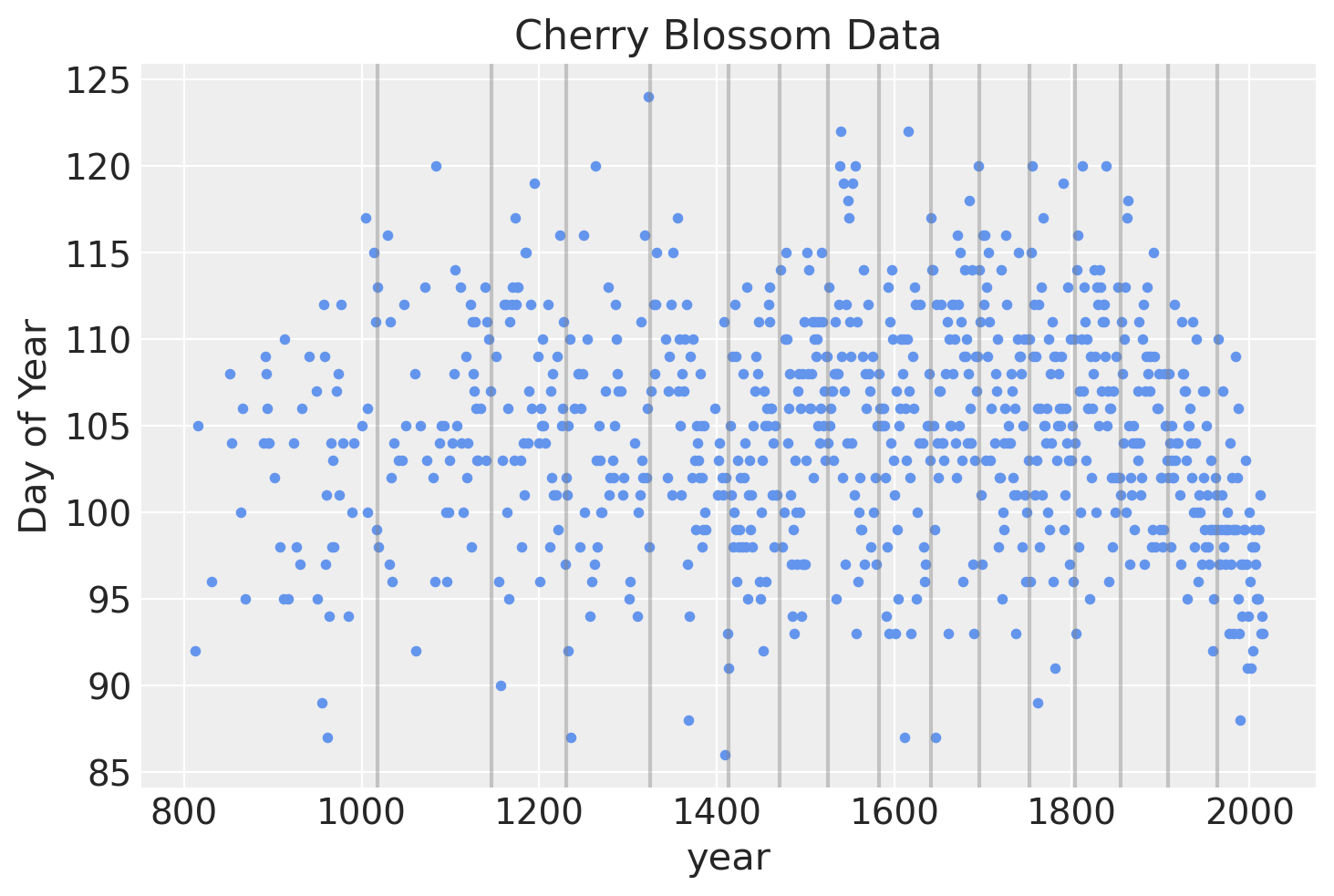 knot_list = np.percentile(blossom_data.year, np.linspace(0, 100, num_knots + 2))[1:-1]