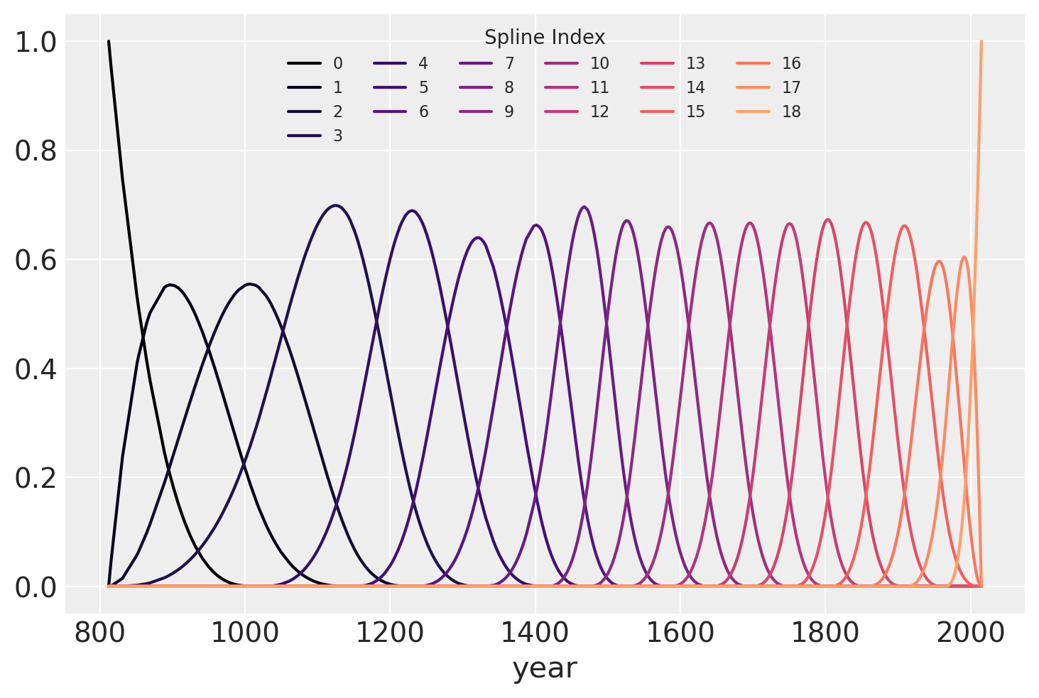 splines_basis = pm.Data("splines_basis", np.asarray(spline_model.dm), dims=("obs", "spline"))