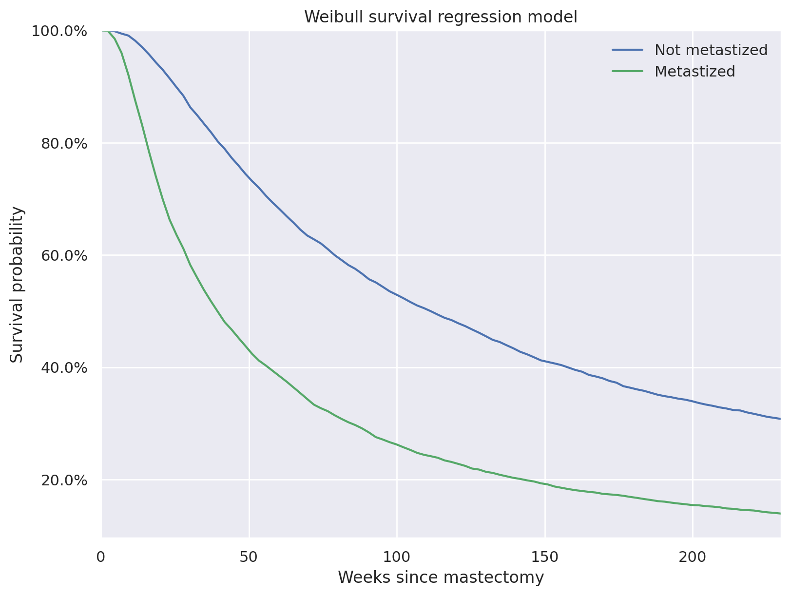 Accelerated failure time models are conventionally named after their baseline survival function, \(S_0\). The rest of this post will show how to implement Weibull and log-logistic survival regression models in PyMC using the mastectomy data.