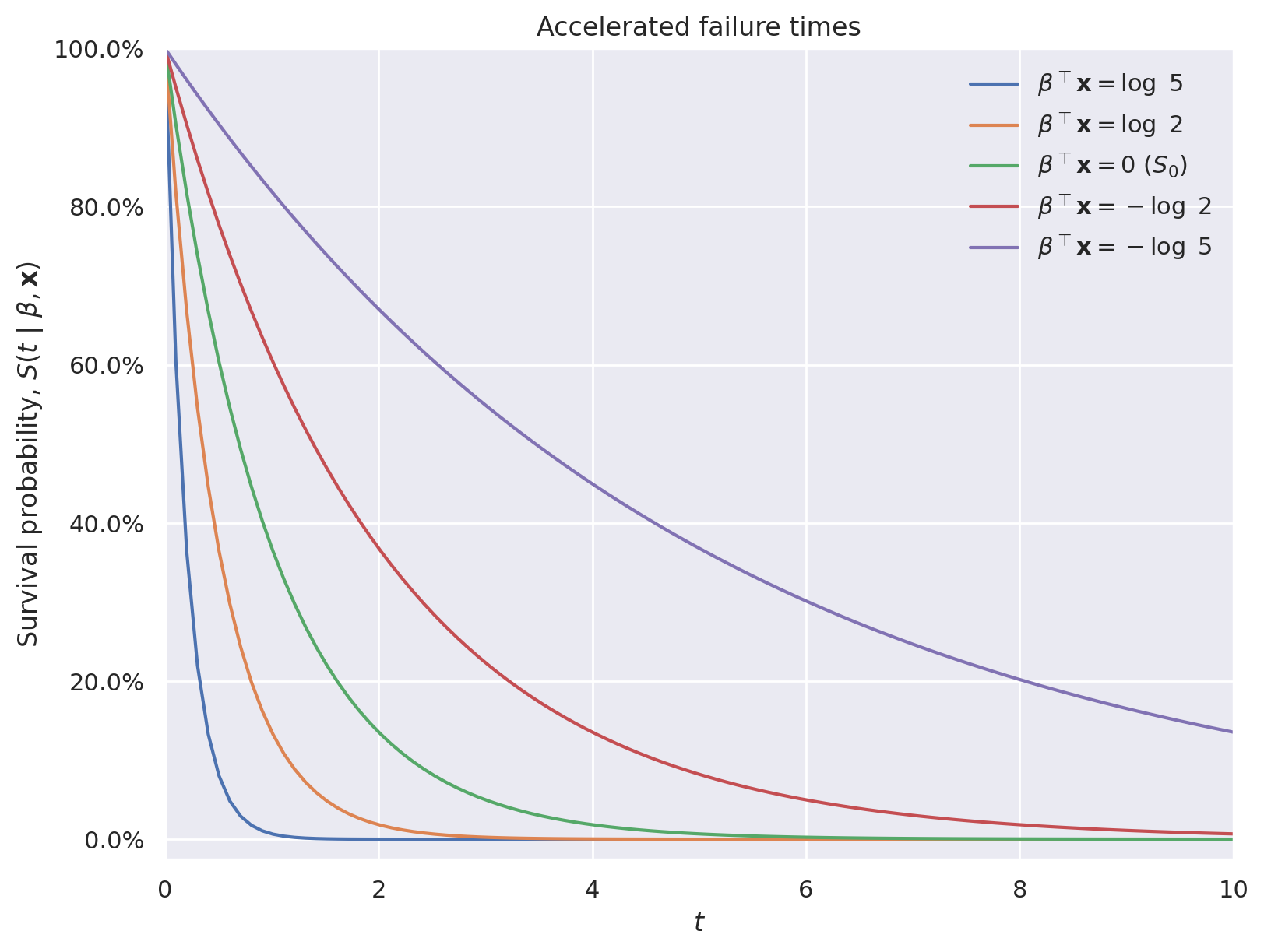 where \(S_0(t)\) is a fixed baseline survival function. These models are called “accelerated failure time” because, when \(\beta^{\top} \mathbf{x} > 0\), \(\exp\left(\beta^{\top} \mathbf{x}\right) \cdot t > t\), so the effect of the covariates is to accelerate the effective passage of time for the individual in question. The following plot illustrates this phenomenon using an exponential survival function.