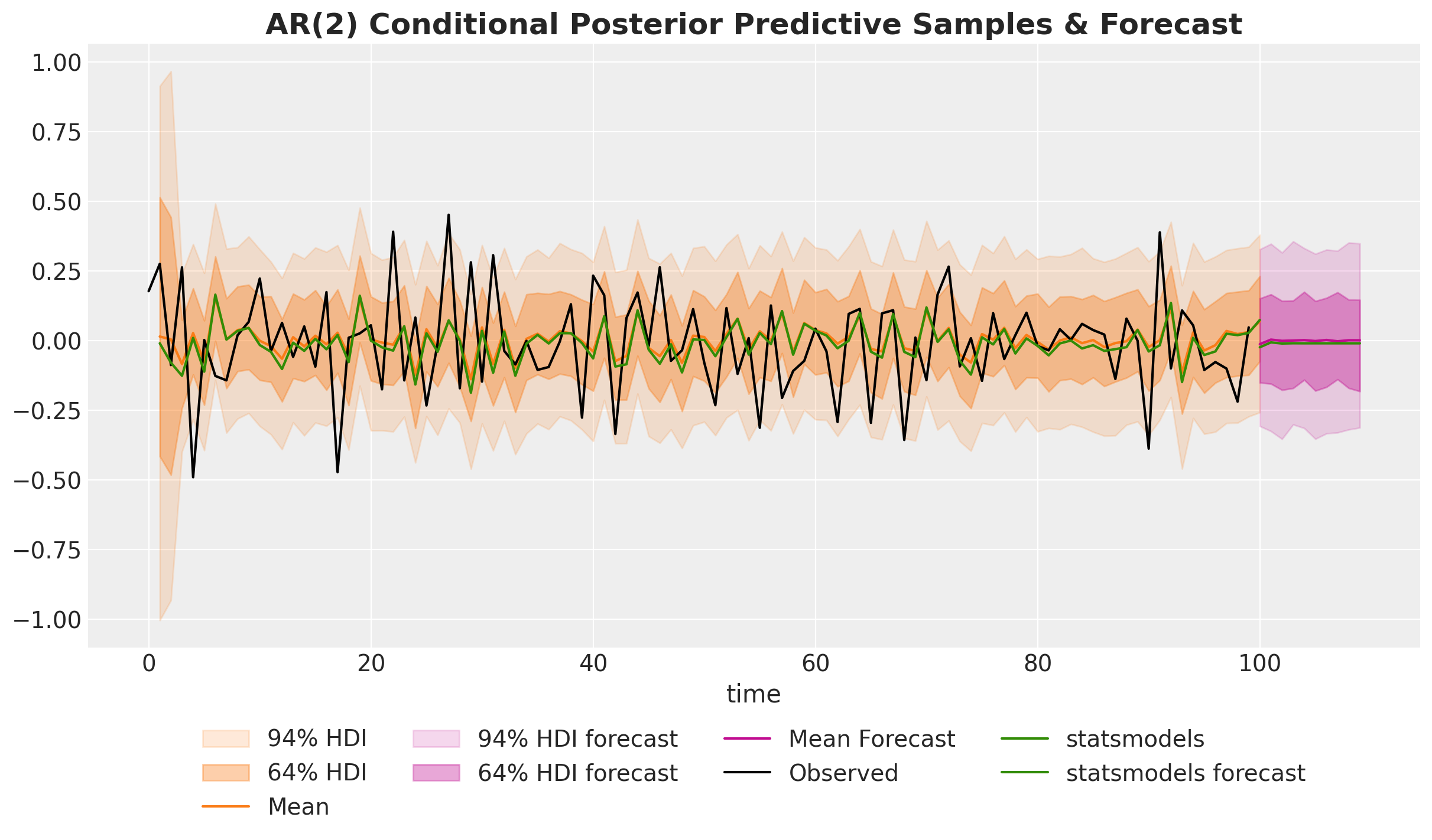 "AR(2) Conditional Posterior Predictive Samples & Forecast",