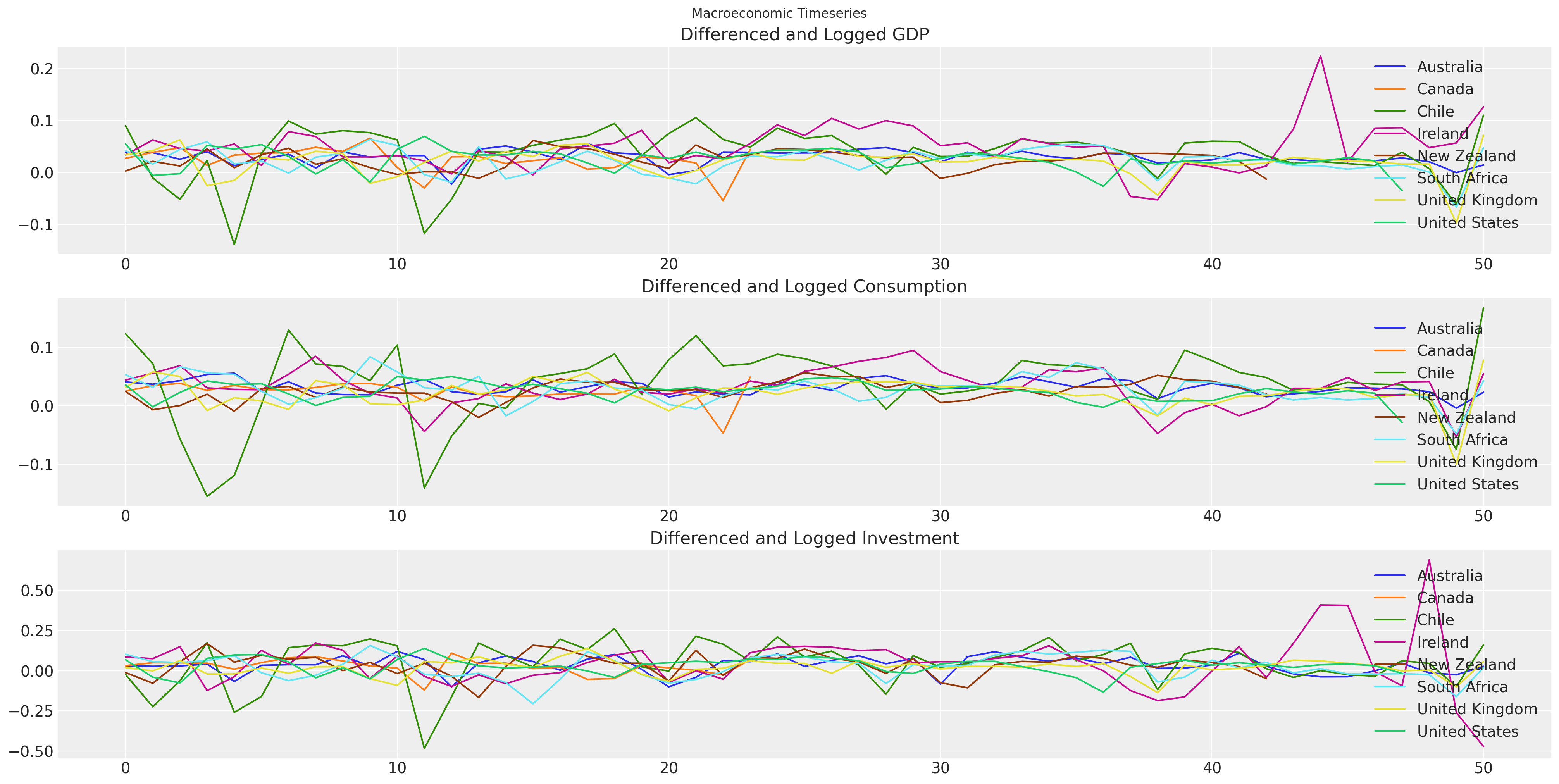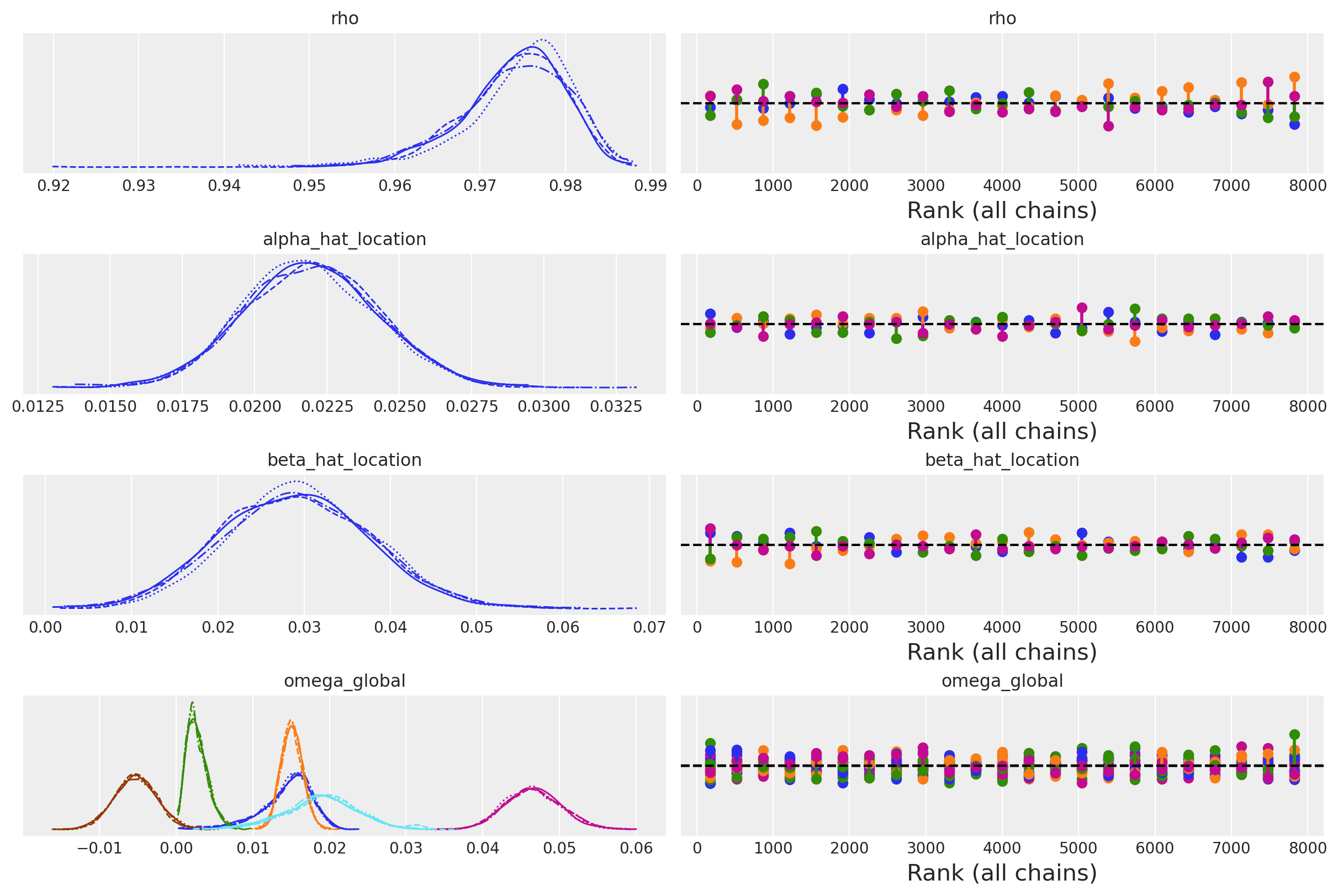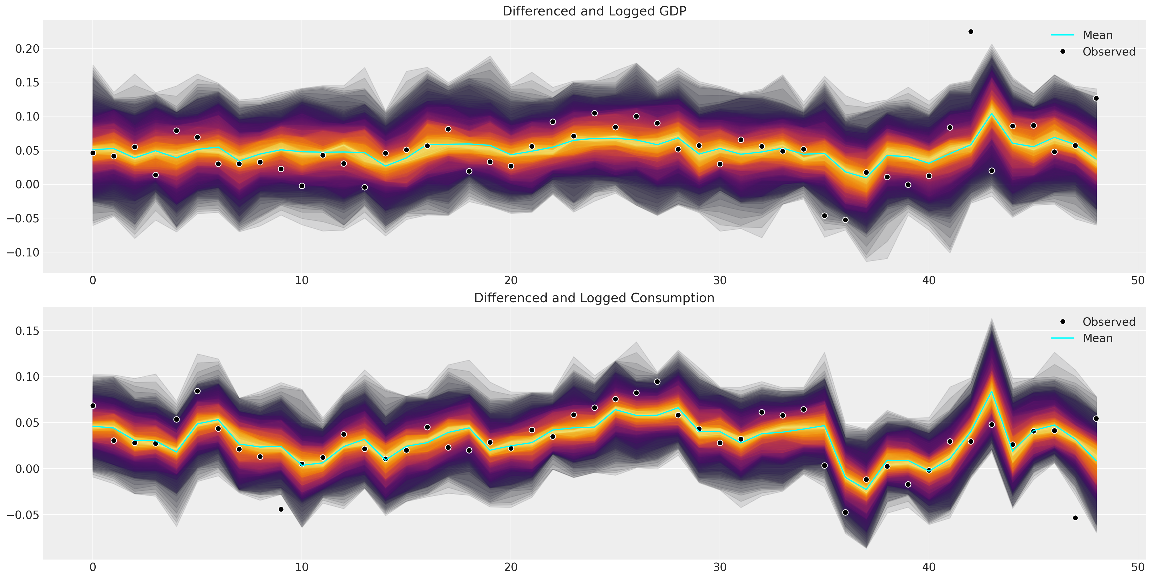 Here we can see that the model appears to have recovered reasonable posterior predictions for the observed data and the volatility of the Irish GDP figures is clear next to the other countries. Whether this is a cautionary tale about data quality or the corruption of metrics we leave to the economists to figure out.
