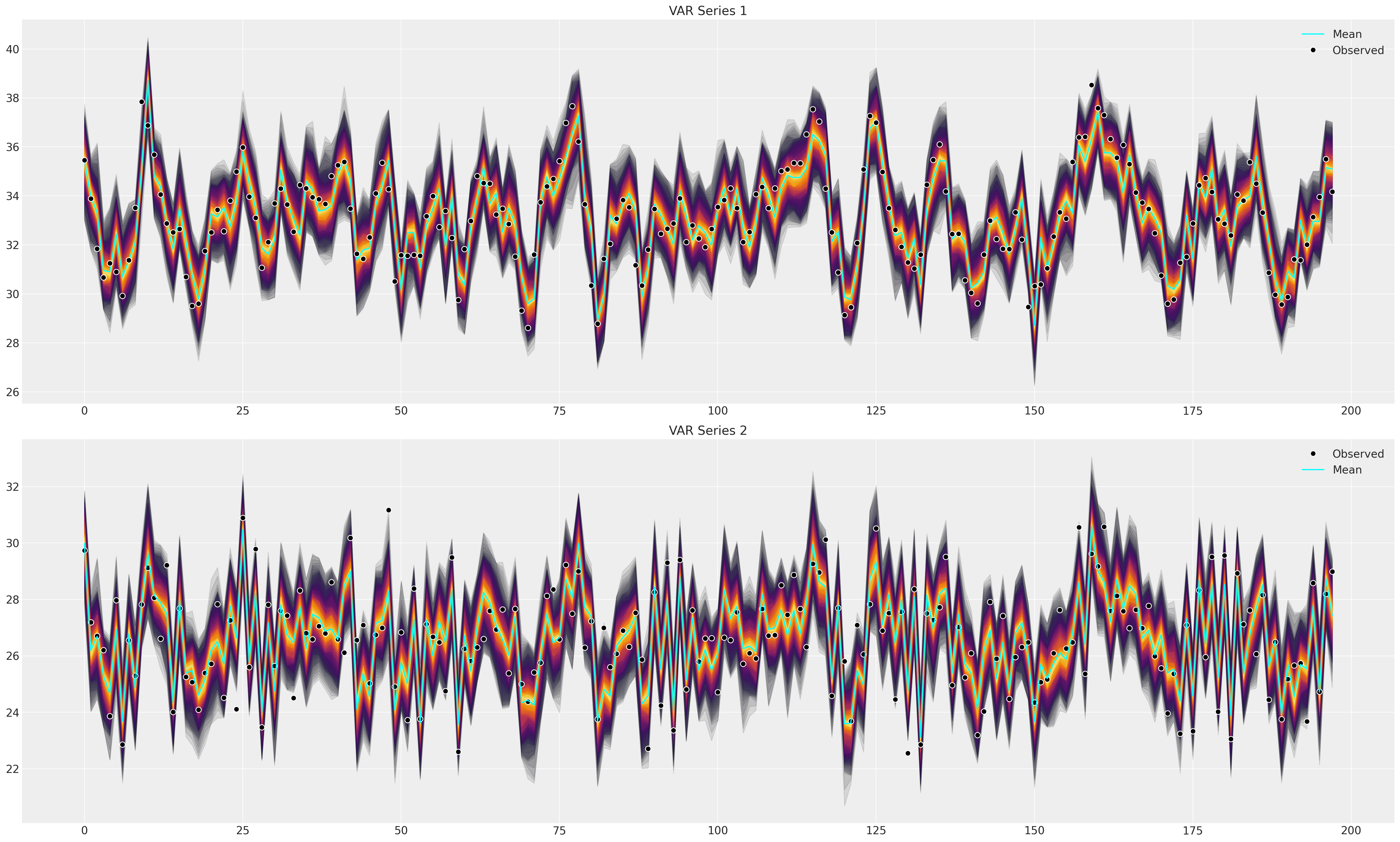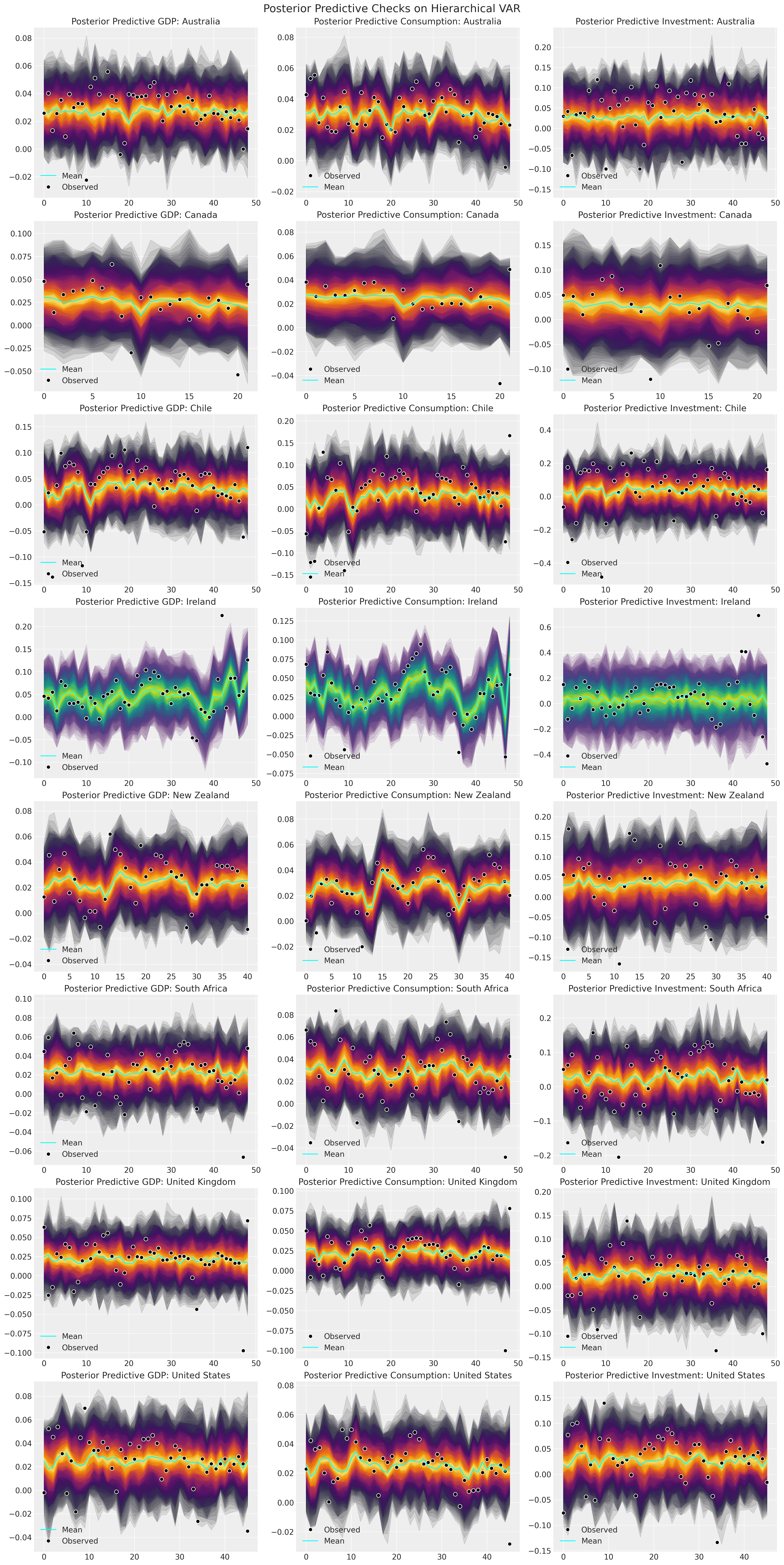 In this post we will (i) demonstrate the basic pattern on a simple VAR model on fake data and show how the model recovers the true data generating parameters and (ii) we will show an example applied to macro-economic data and compare the results to those achieved on the same data with statsmodels MLE fits and (iii) show an example of estimating a hierarchical bayesian VAR model over a number of countries.