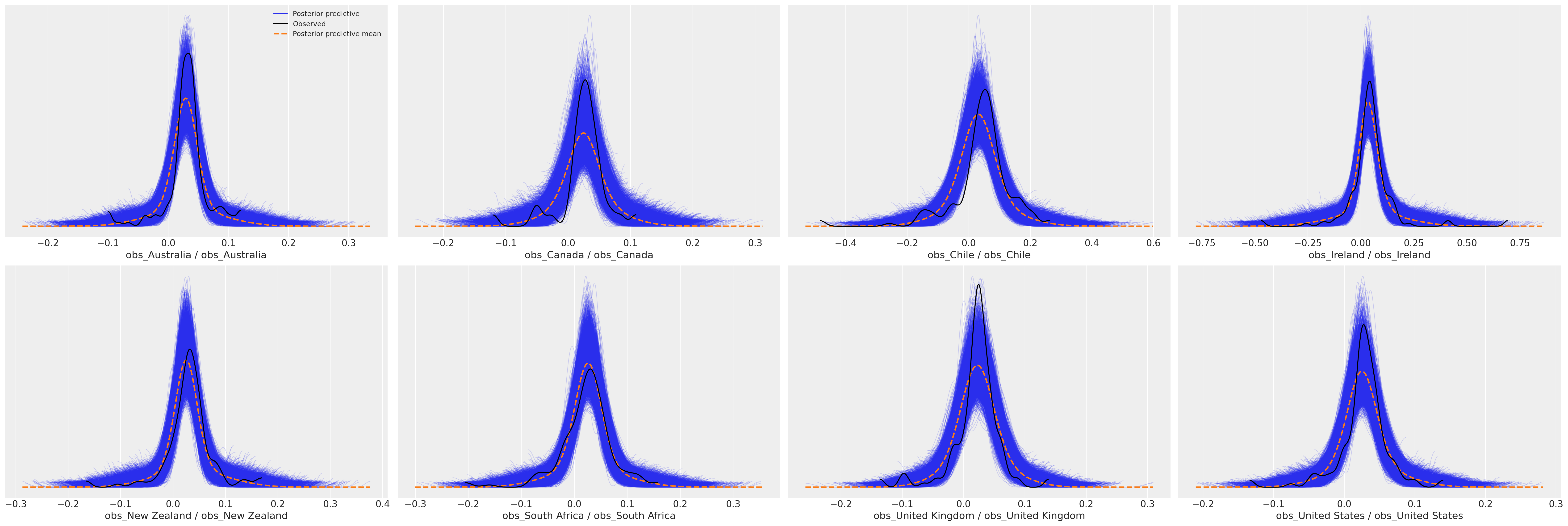 Next we’ll plot the model fits for each country to ensure that the predictive distribution can recover the observed data. It is important for the question of model adequacy that we can recover both the outlier case of Ireland and the more regular countries such as Australia and United States.