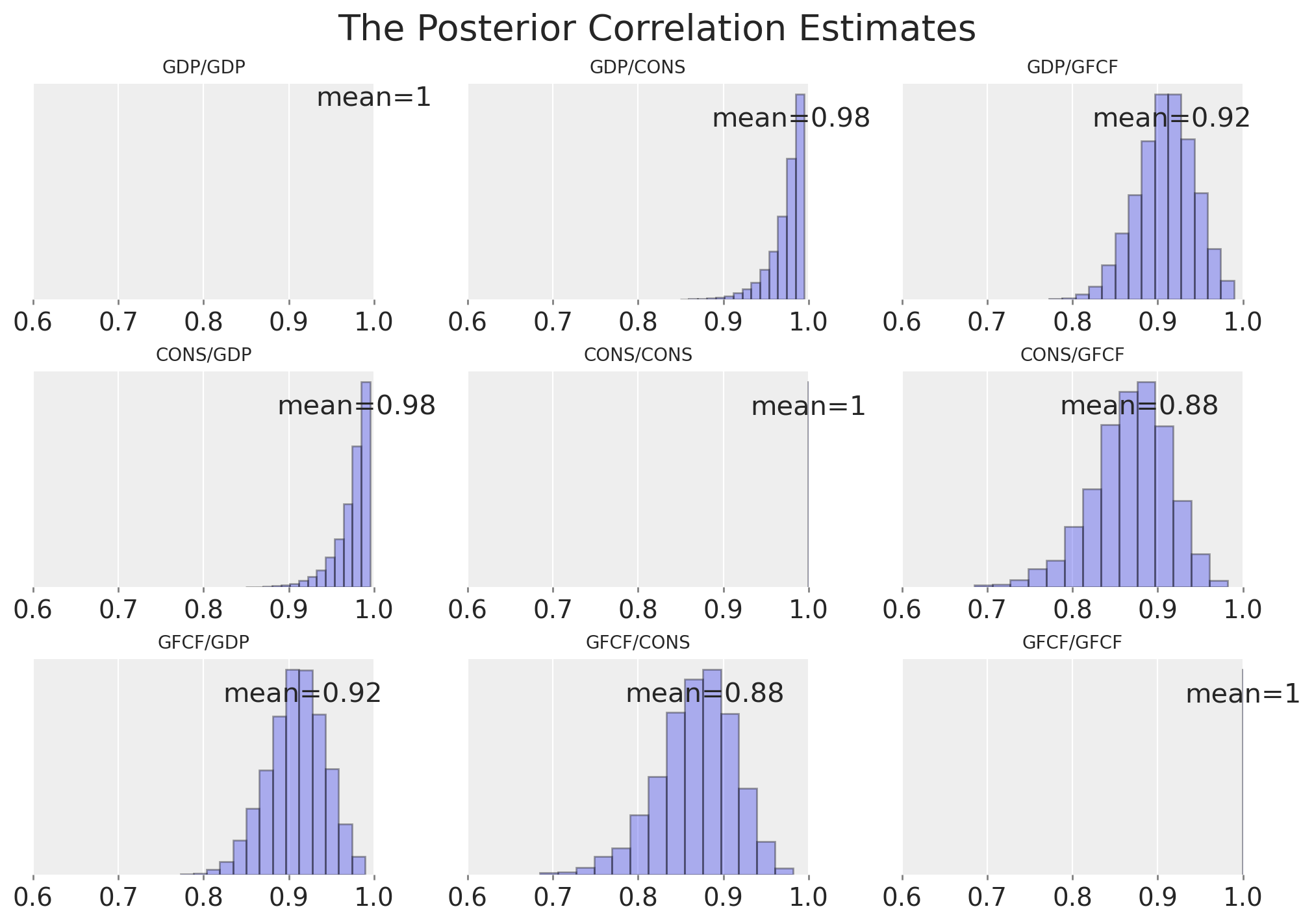 We can see these estimates of the correlations between the 3 economic variables differ markedly from the simple case where we examined Ireland alone. In particular we can see that the correlation between GDF and CONS is now much higher. Which suggests that we have learned something about the relationship between these variables which would not be clear examining the Irish case alone.