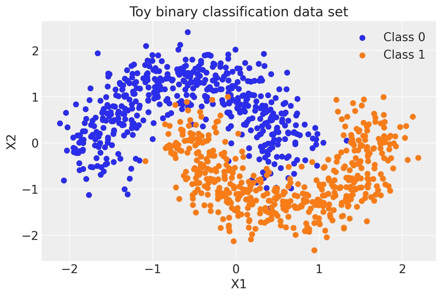 ax.set(xlabel="X1", ylabel="X2", title="Toy binary classification data set");