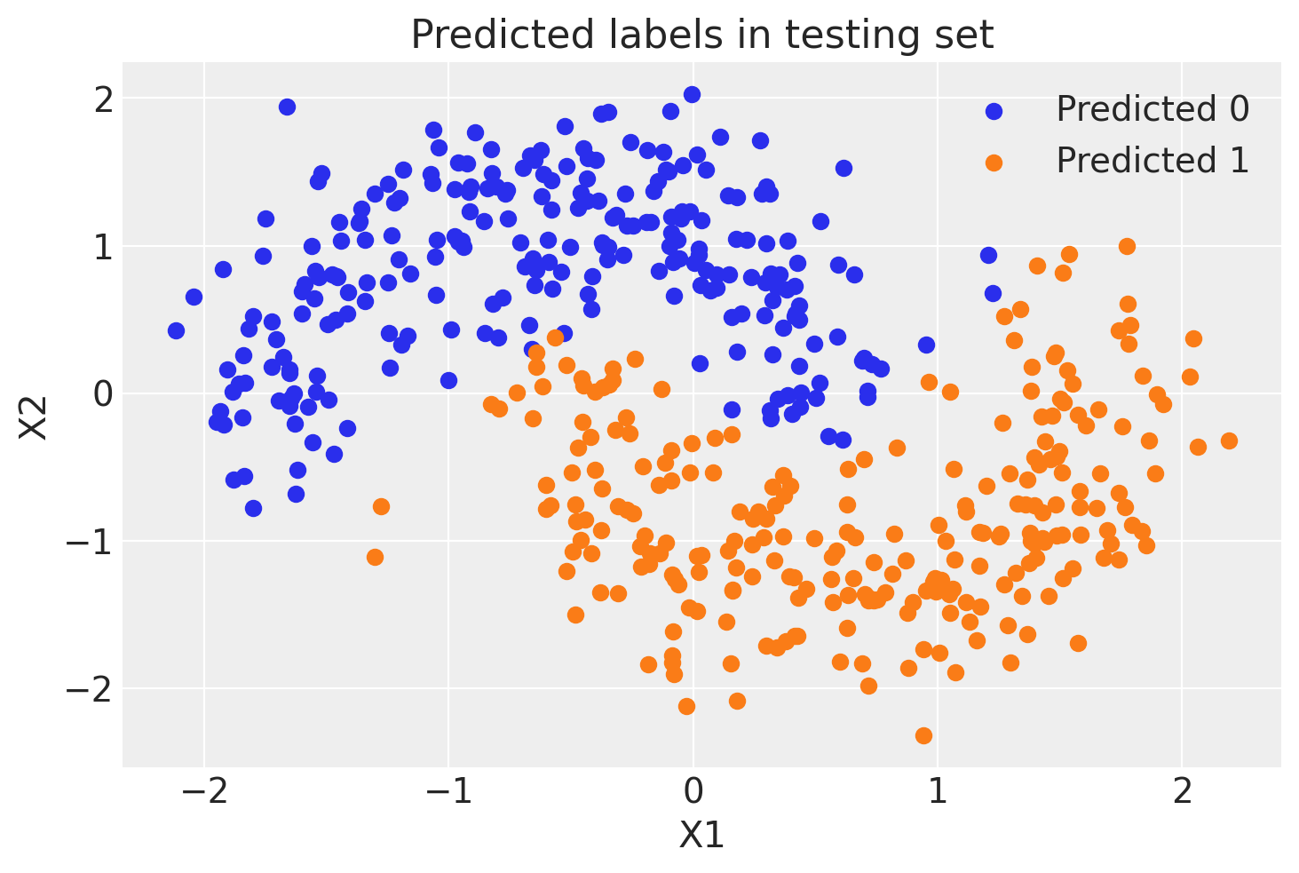 ax.scatter(X_test[pred == 0, 0], X_test[pred == 0, 1], color="C0", label="Predicted 0")