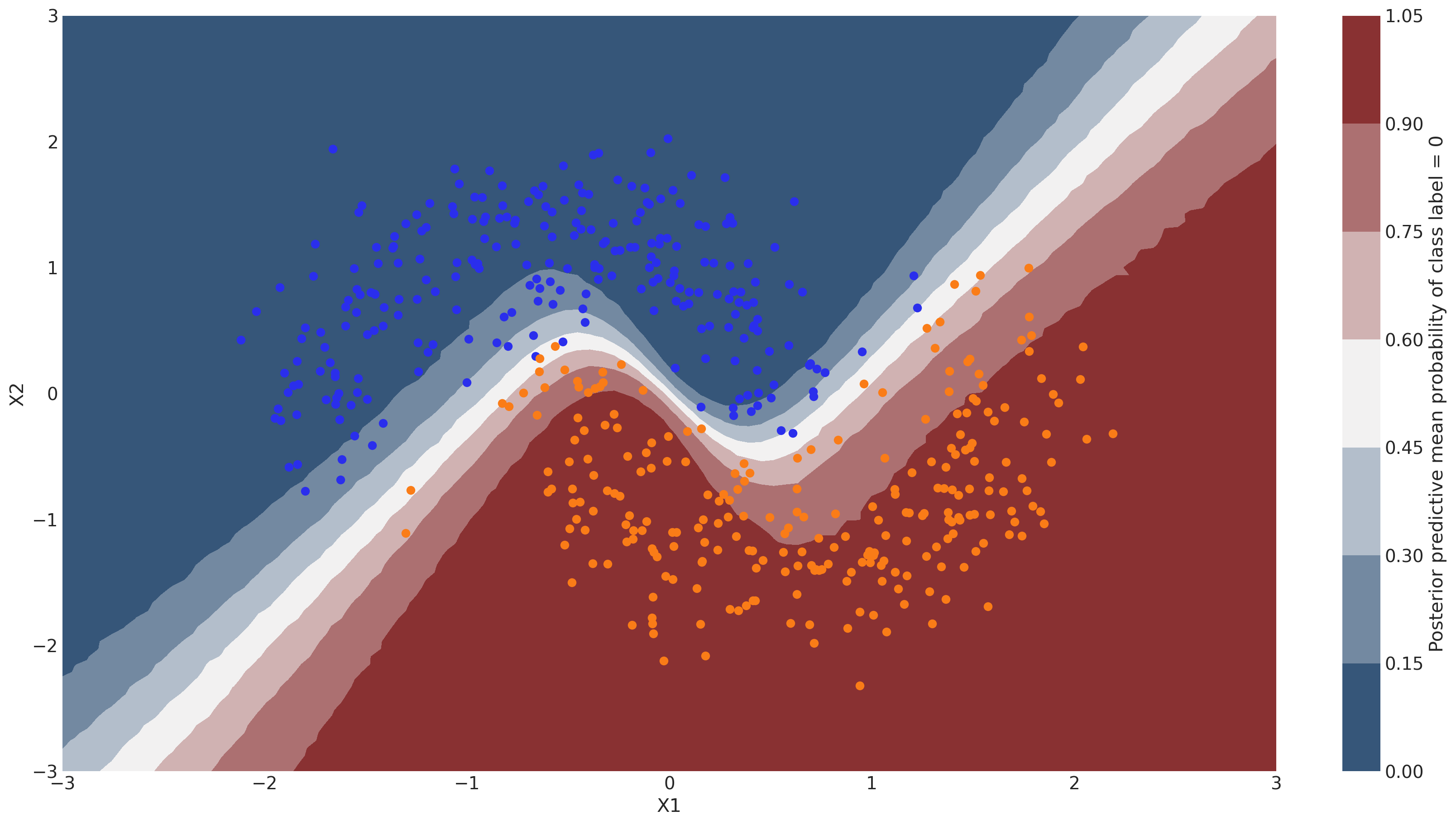 cbar.ax.set_ylabel("Posterior predictive mean probability of class label = 0");
